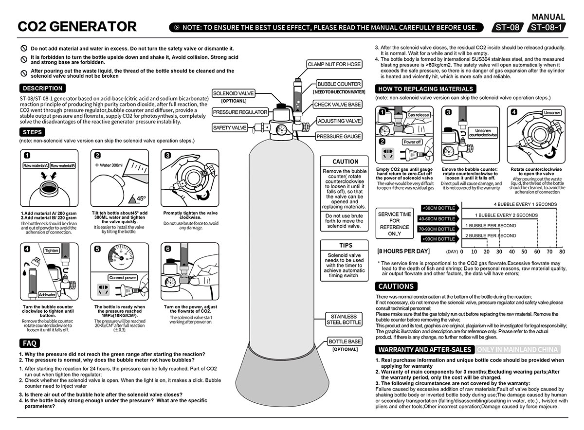 Máy tạo CO2 bể cá ST-08-1 sử dụng nguyên lý phản ứng axit-bazơ, phản ứng axit citric với natri bicarbonate để tạo ra CO2 có độ tinh khiết cao. Thông qua công thức được xây dựng khoa học và quy trình phản ứng hiệu quả, thiết bị sẽ giải phóng CO2 đều đặn, cung cấp nguồn khí liên tục cho cây thủy sinh, đáp ứng nhu cầu quang hợp của chúng và thúc đẩy sự phát triển khỏe mạnh. So với các máy phát điện kiểu phản ứng truyền thống, ST-08-1 có tính năng kiểm soát áp suất được cải thiện. Được trang bị bộ điều chỉnh áp suất chuyên dụng, bộ đếm bong bóng và bộ khuếch tán, nó mang lại áp suất đầu ra ổn định và phân tán bong bóng đồng đều, loại bỏ sự bất tiện do biến động áp suất gây ra.